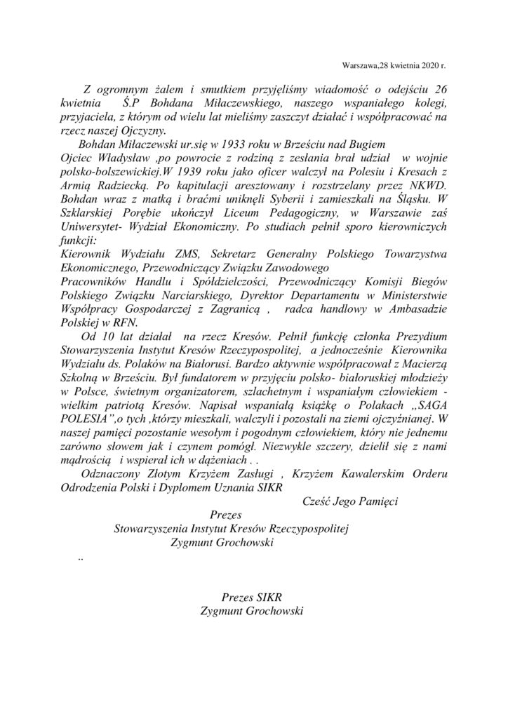 Stowarzyszenie Instytut Kresów Rzeczypospolitej składa wyrazy głębokiego współczucia